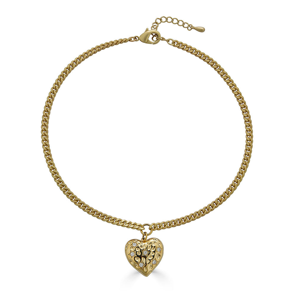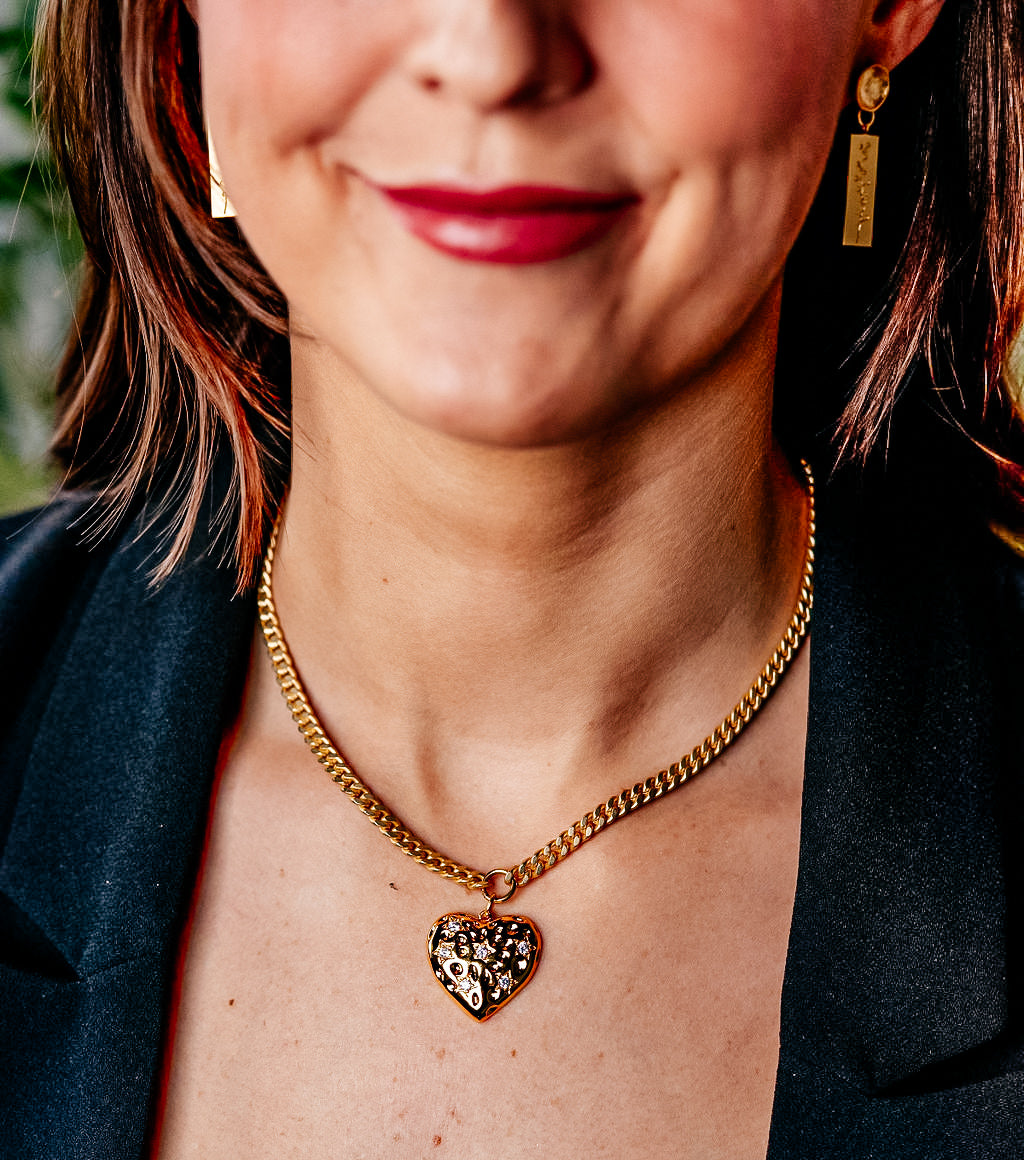 Make a bold statement with this gold heart pendant necklace. Featuring a striking gold-plated chain paired with a beautifully detailed heart charm, this piece exudes timeless romance and elegance. The pendant is adorned with intricate floral engravings and sparkling accents, adding a touch of glamour to its classic design.